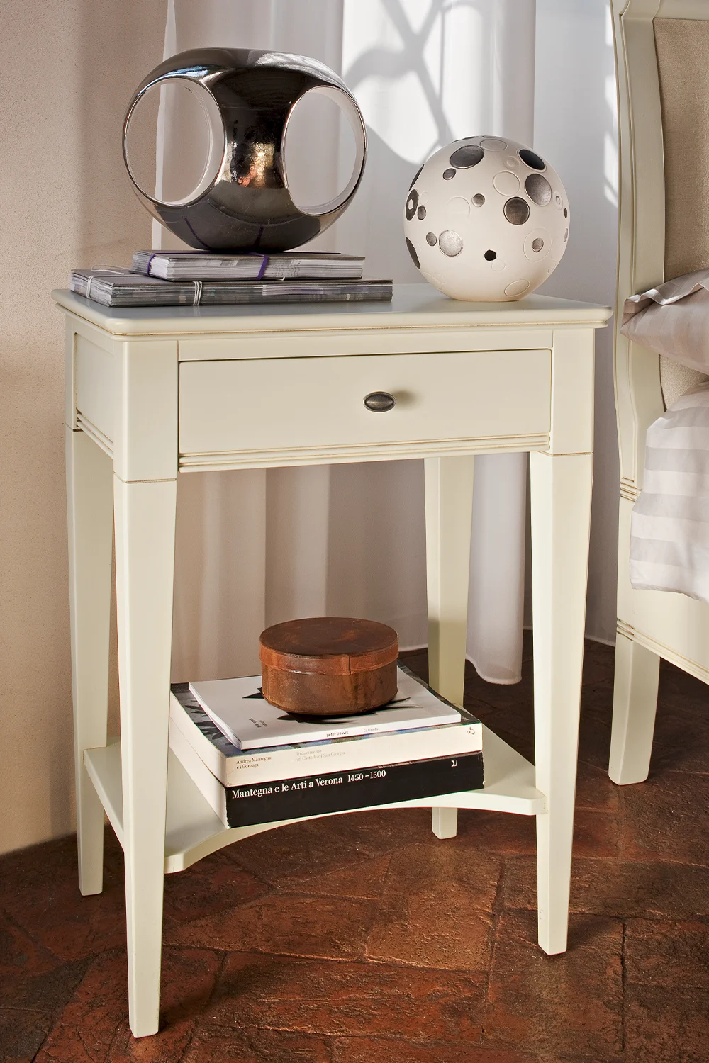 Le Fablier Zircone classic bedside table has a useful drawer and a graceful shelf and is available in a variety of finishes.