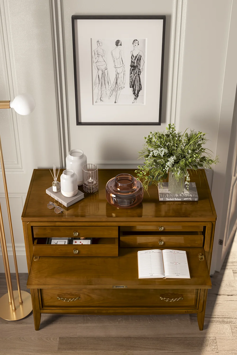 What apparently looks like the first of three drawers is actually a flap door, which when opened reveals a convenient shelf. In addition to the secret flap, the Scrigno Le Fablier classic chest of drawers also offers four small drawers where you can store your most precious mementos or personal items.