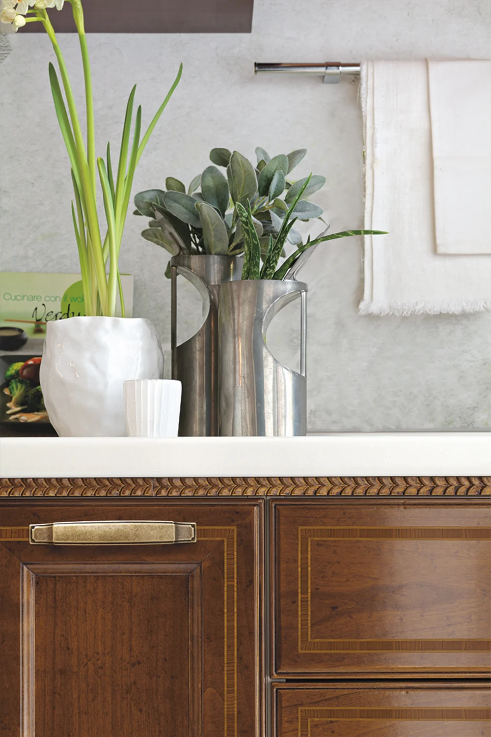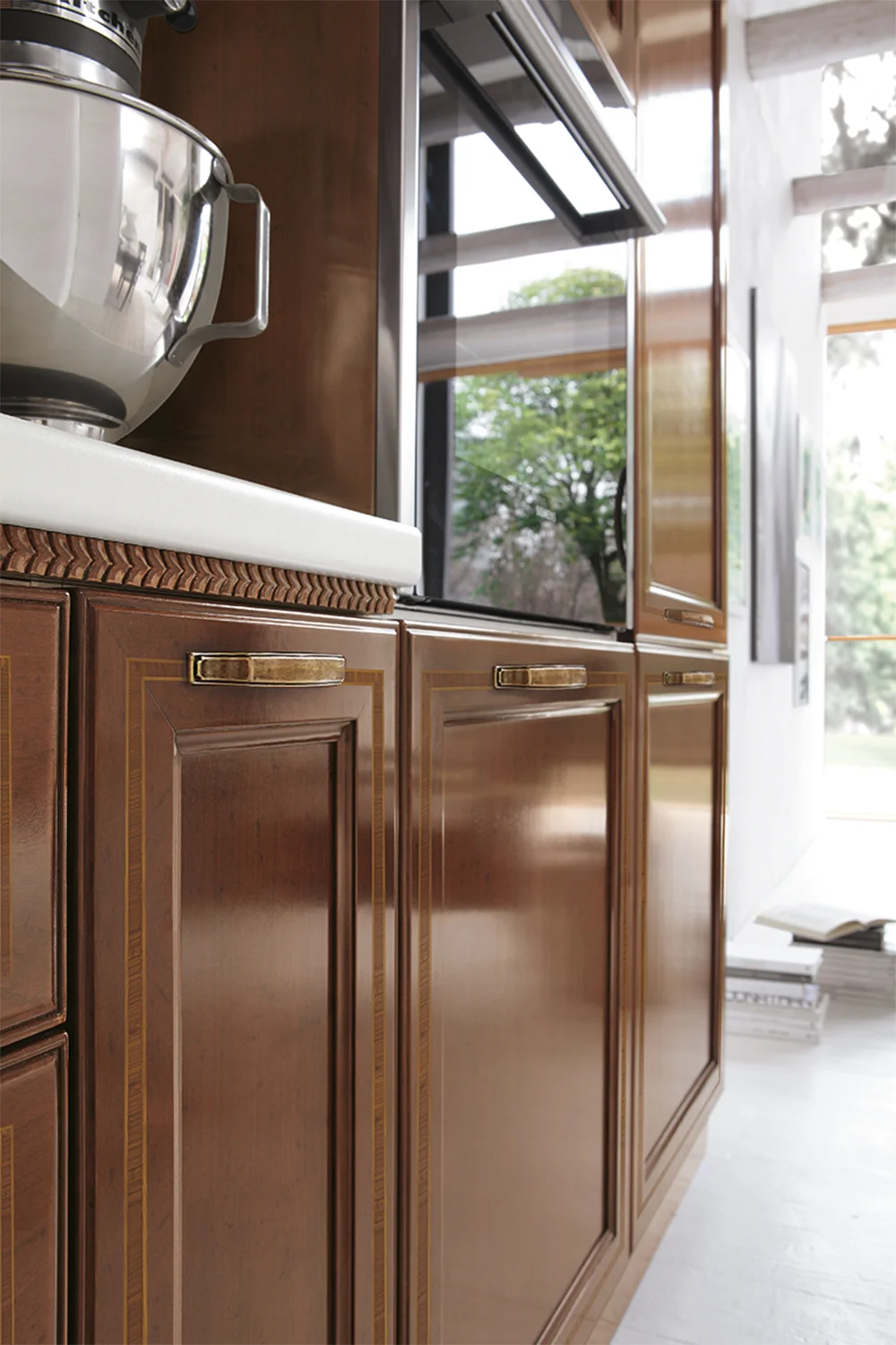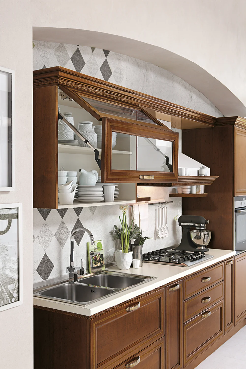 Designed for those who love the warm and genuine atmosphere of tradition, the classic kitchen 01 perfectly adapts to any requirement. It is characterized by a classic design and capacious baskets, closed doors and elegant columns. The integration of state-of-the-art technologies, such as locking brakes and different opening types, ensures practicality and comfort of use. The transparent glass windows, which enrich the composition, give lightness and create points of light that enhance the entire environment. The kitchen’s worktops, structure, door glazing and handles are widely customizable.
