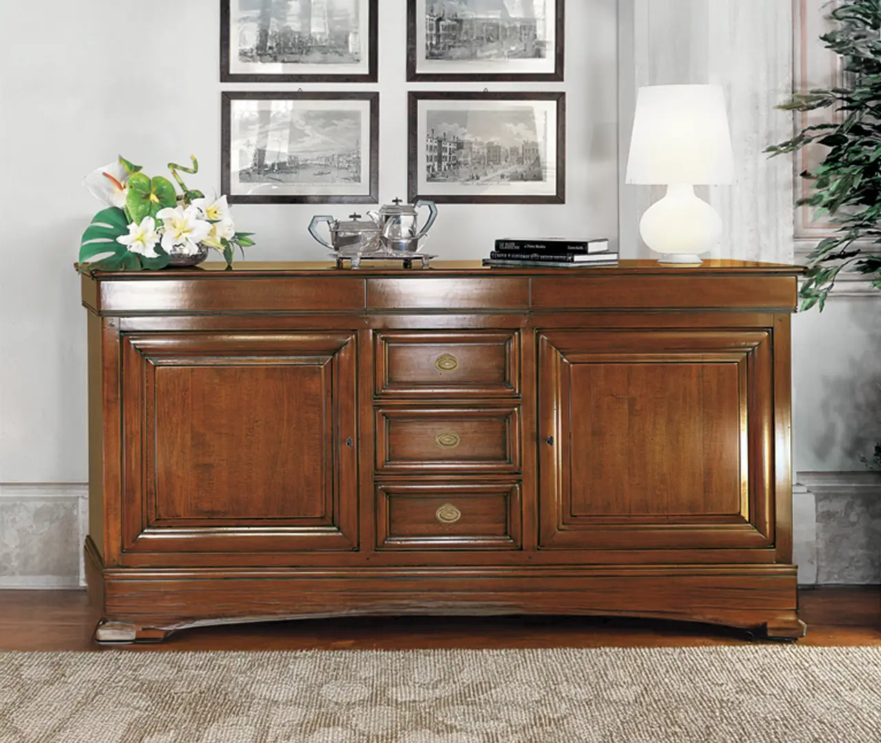The Giada classic sideboard features a harmonious basswood frame with two side doors enclosing three central drawers. The Le Fablier firebrand mark guarantees the authenticity and quality of the Giada classic sideboard, distinguishing it from imitations and confirming the attention to detail and craftsmanship that distinguishes every piece of furniture in the Le Gemme classic collection.
