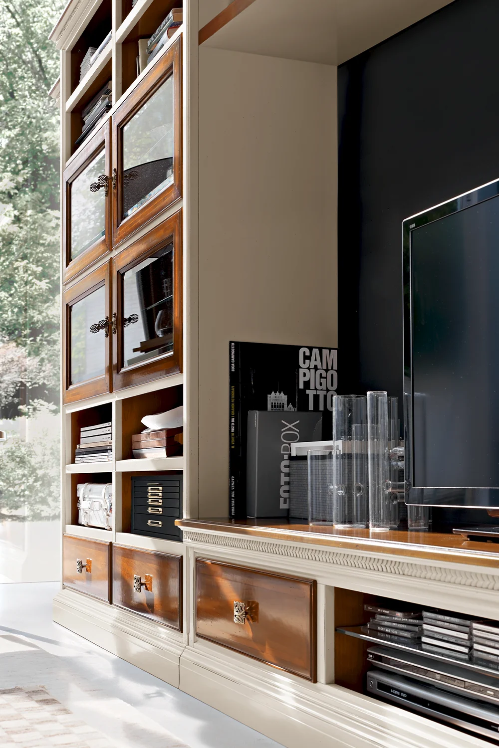 The lower part of the composition is defined by a long base with four drawers and an open compartment horizontally arranged, offering wide space for the organization and order of the living room. From one end of the base stand two columns, which consist of eight open compartments that are perfect for storing everything you need. They alternate with four glass hinged doors, which add a touch of classic elegance and can be locked to protect the most precious objects. Harmony and continuity are given by a shelf that joins the top of the two columns with the opposite end, making the entire piece of furniture a decorative element of great aesthetic impact.