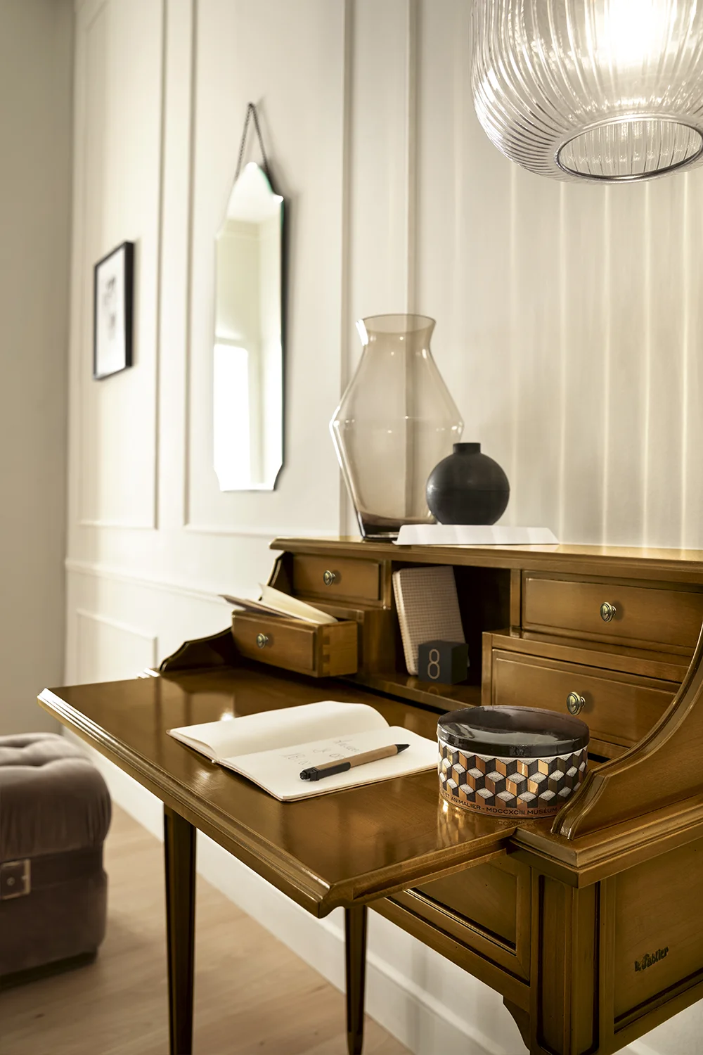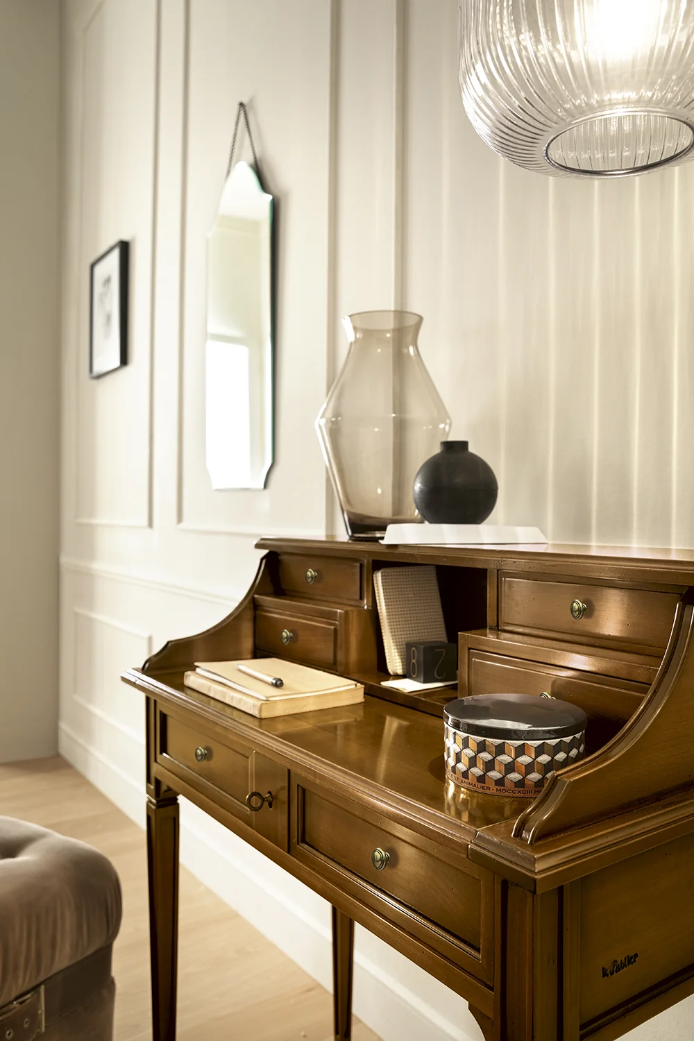 Its refined style makes it a focal point in the room, drawing attention with its discreet yet enchanting presence. The pull-out top of the Segreto classic desk provides all the space you need to write, draw or work in comfort.
