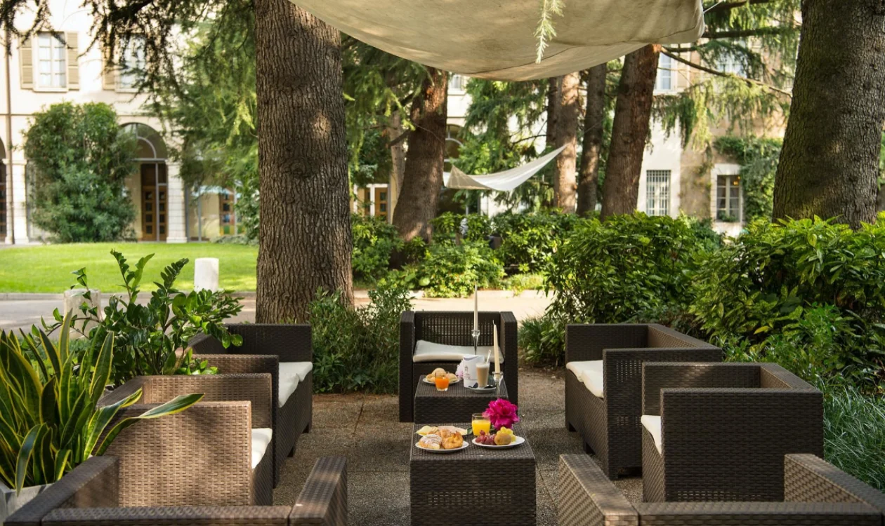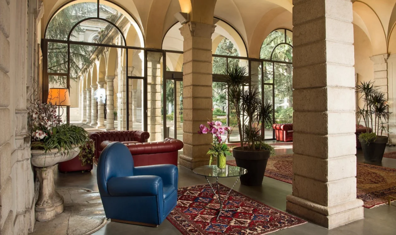 Hotel Centro Paolo IV is a green oasis and monumental Baroque-style experience in an ancient palace in the heart of Brescia. Le Fablier provided the complete furnishings for the rooms.