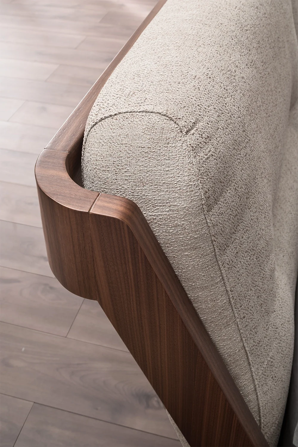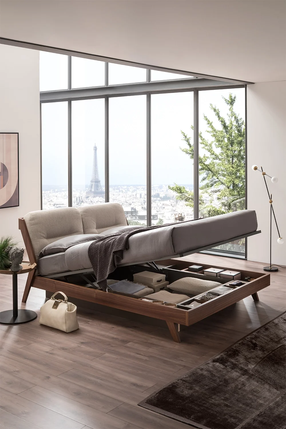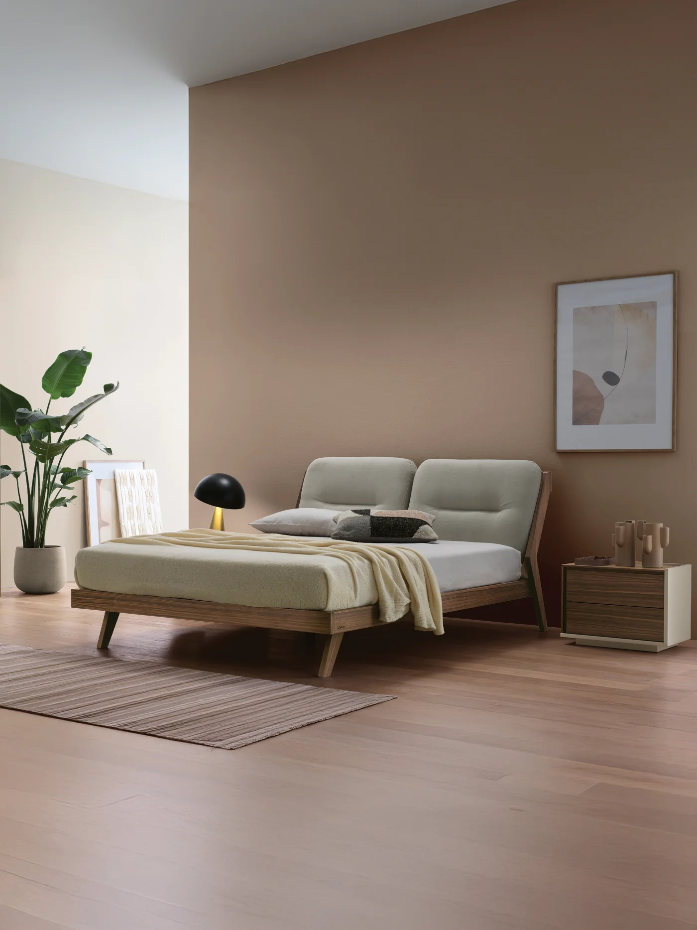 Characterized by a solid frame in Canaletto walnut, which adds warmth and sturdiness, the modern Sussurro bed is distinguished by its two padded cushions resting on the headboard, offering a touch of softness and superior comfort.