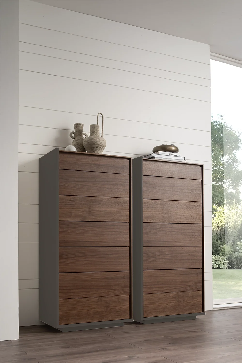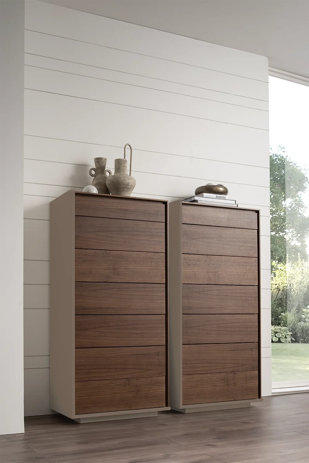 Made of Canaletto walnut with lacquered MDF inserts, it plays with material contrasts that enhance the design and craftsmanship of the Zenit collection. The seven spacious and well-distributed drawers offer a storage solution that combines aesthetics and functionality. A piece of furniture designed for those who love order without compromising on style.