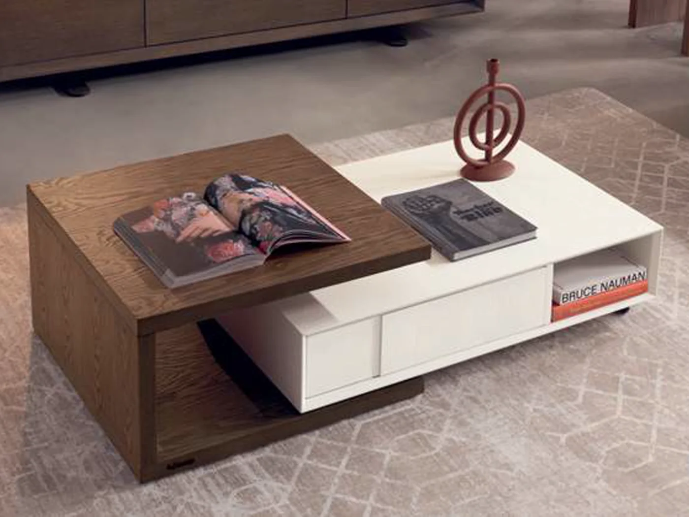 The presence of the center plate allows the coffee table to be transformed into various furniture combinations, allowing it to be adapted to personal needs and tastes. The brushed semi-flamed ash wood used in its manufacture gives the piece of furniture a unique and distinctive character.