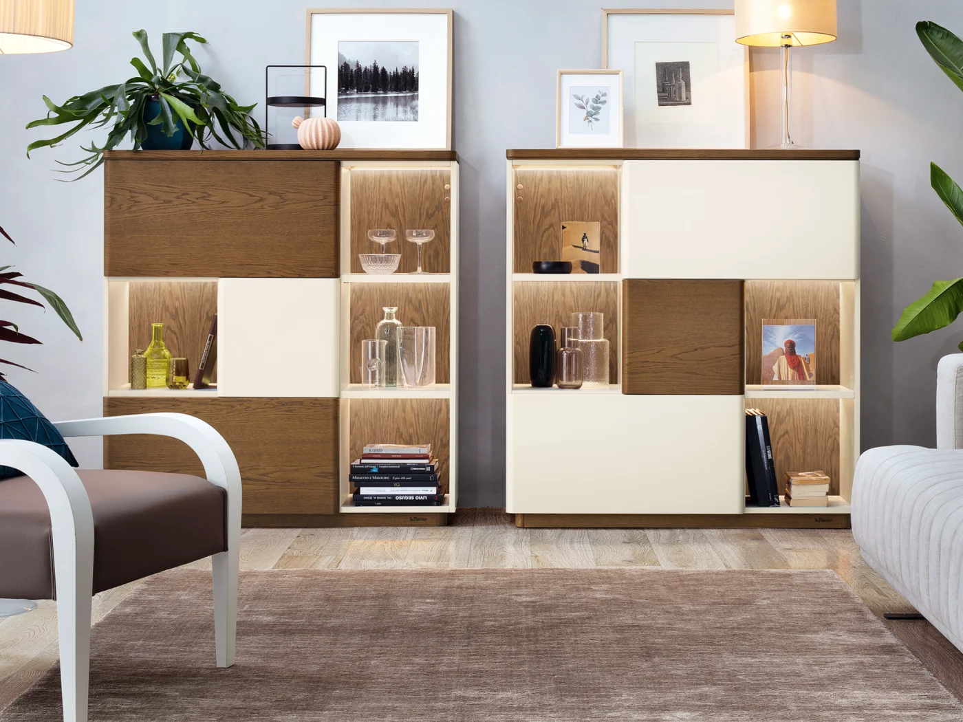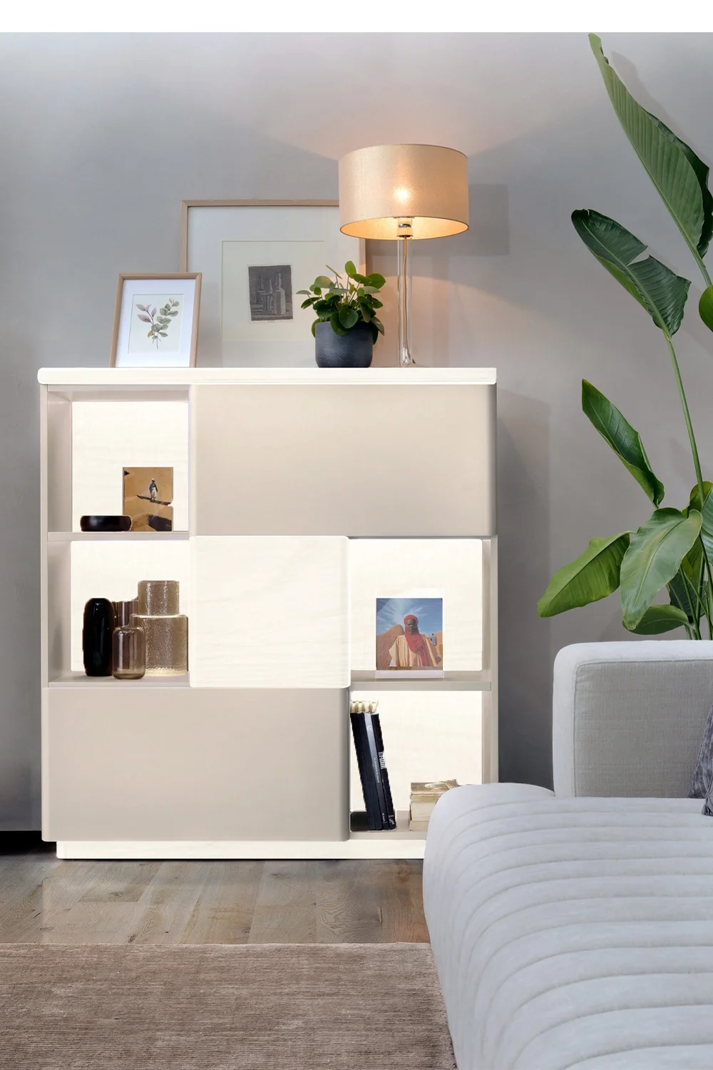 The low module of the Rama modern sideboard offers a combination of contemporary design and functionality. Featuring two essence doors and four LED-lit cubbies, this cabinet meets storage space needs in an elegant and innovative way.