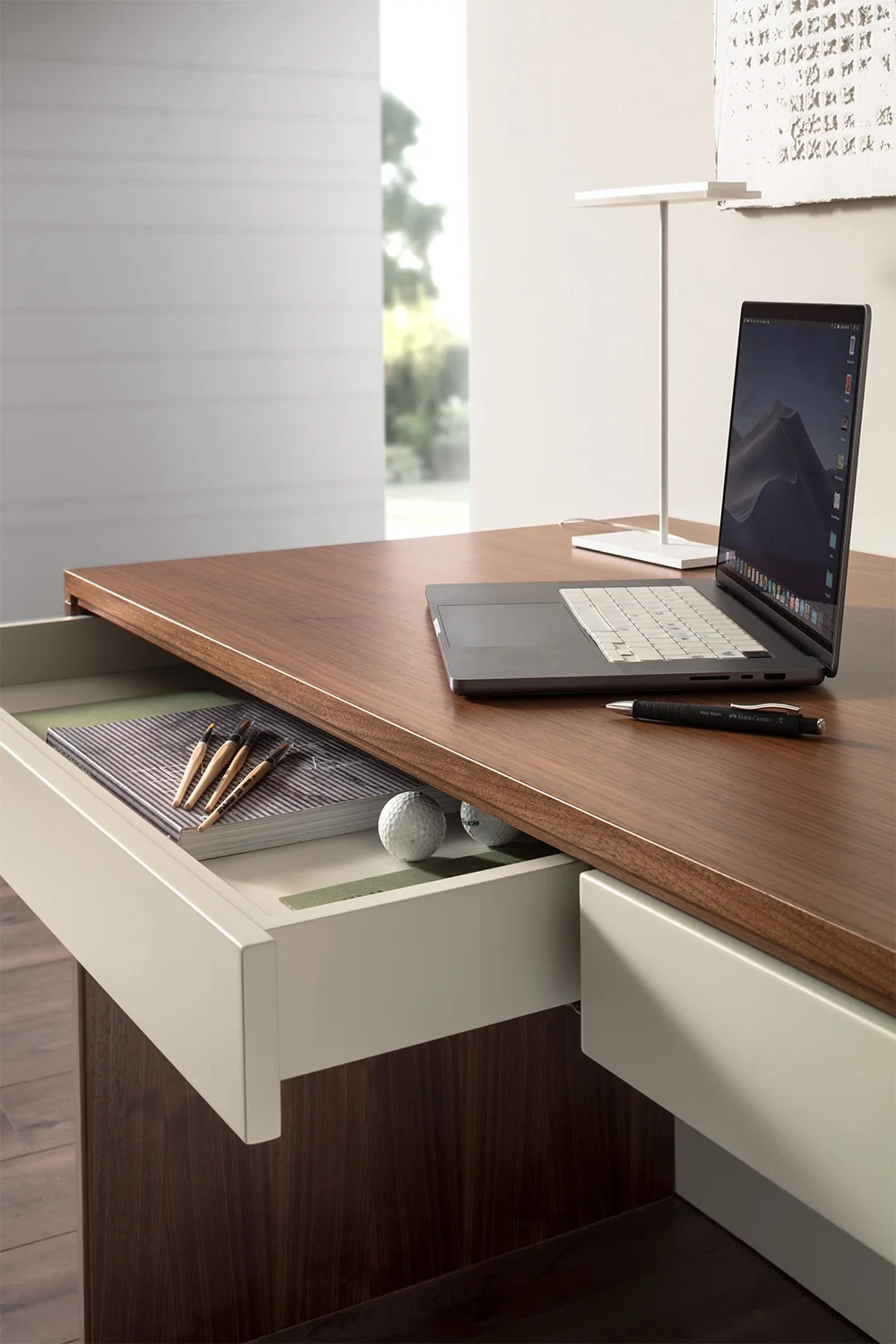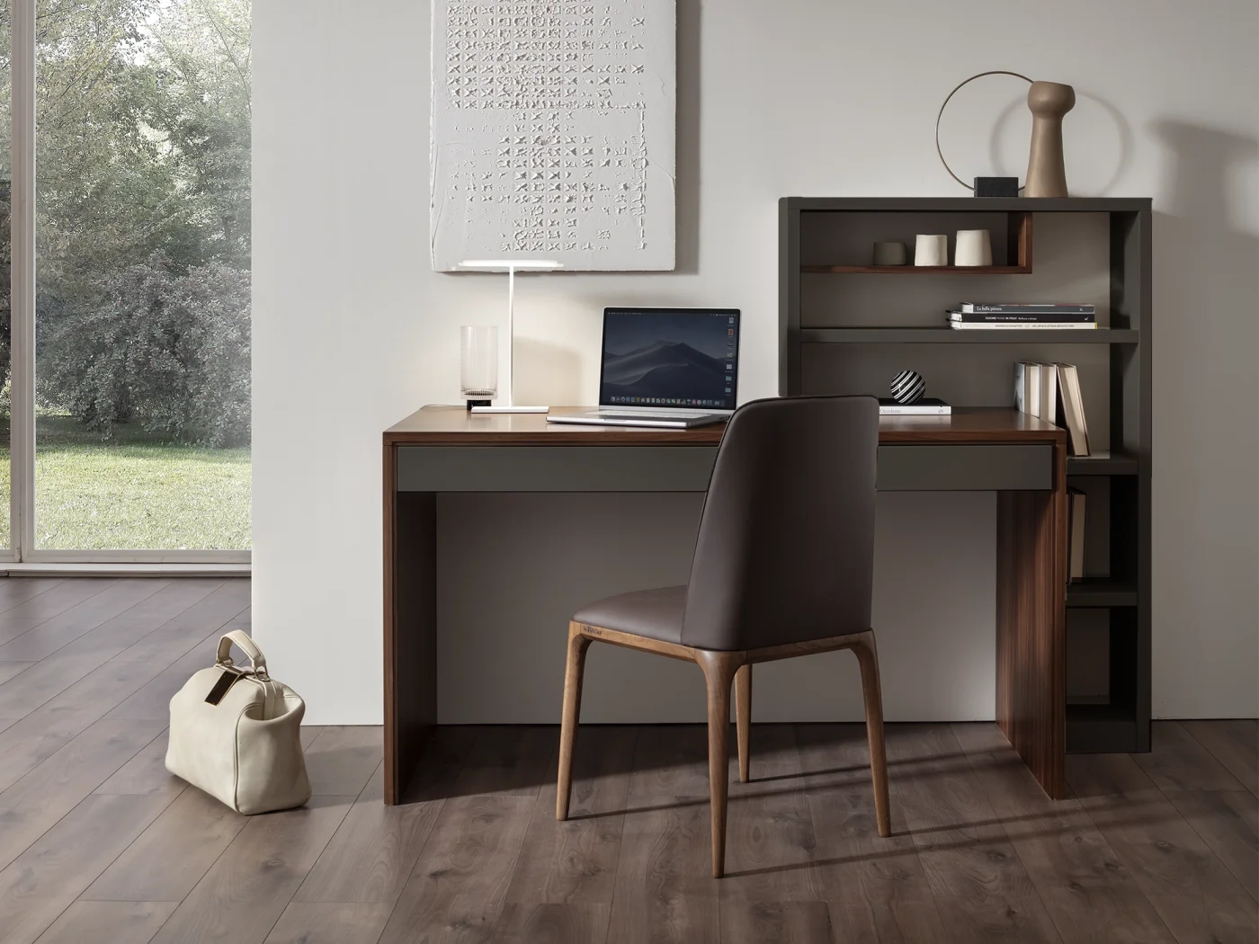 The Omega desk is completed with a system of integrated shelves and open compartments, ideal for organising books and objects. A versatile and refined solution,perfect for creating study or work corners that invite concentration and daily well-being.