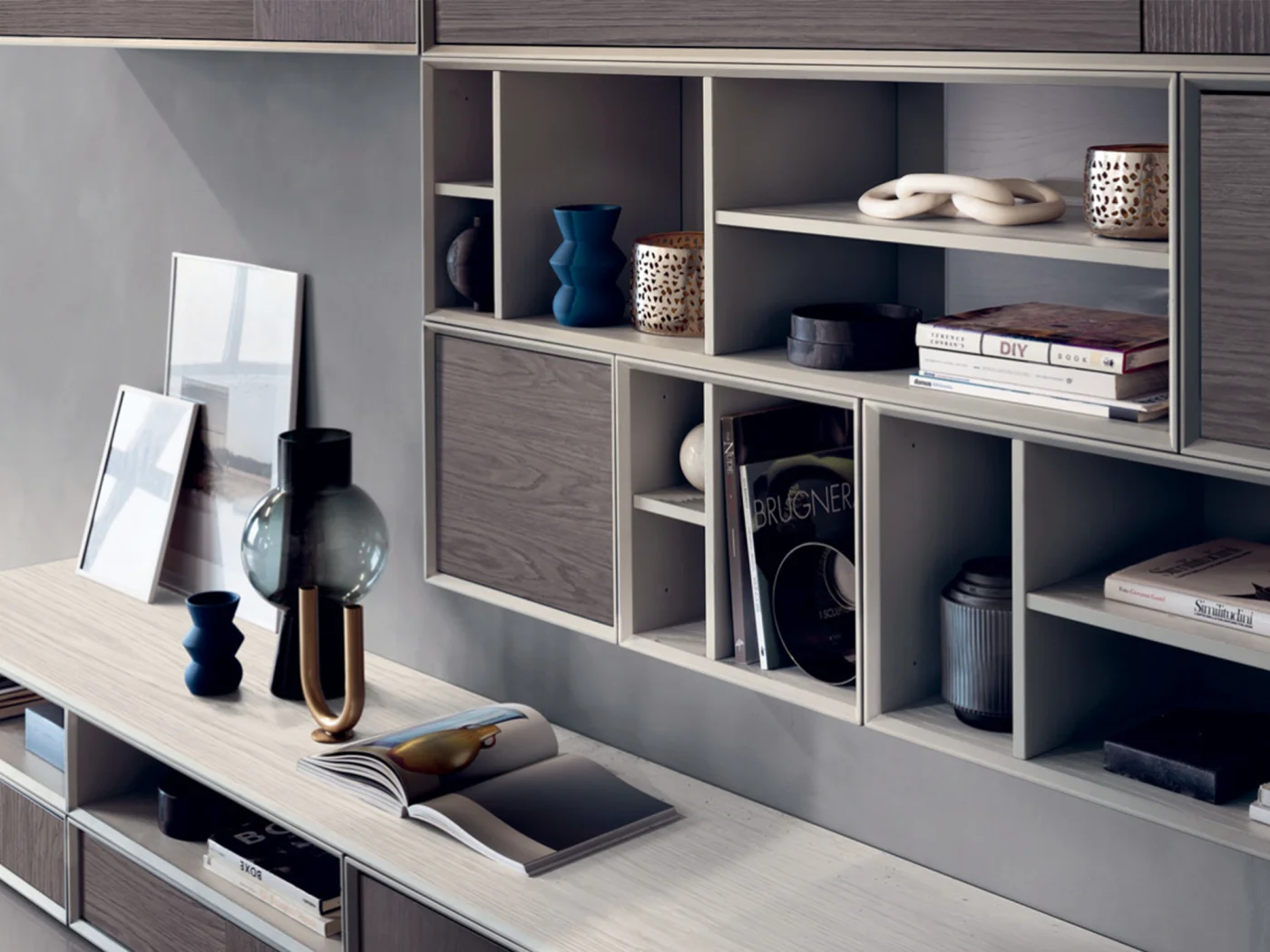 It combines a floor-standing base with suspended wall units arranged on three levels, offering a balanced mix of drawers, doors and open compartments. The top level extends lengthwise, creating a clean line parallel to the base, while the wide side space is designed to accommodate a TV, making the composition ideal for those seeking practicality and style in one. The simple and modern lines create a feeling of freshness and wideness, perfect for those who love minimalist and elegant environments. There are overhangs on surfaces, which add an interesting play of lights and enhance the natural beauty of the wood grains.