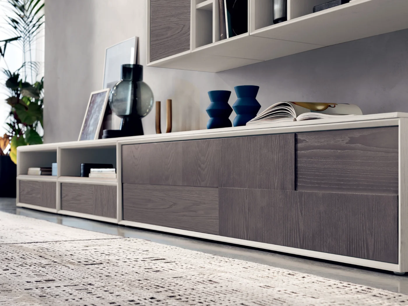 The modern wall unit 01 is realized in brushed ash wood and it is available in different finishes.