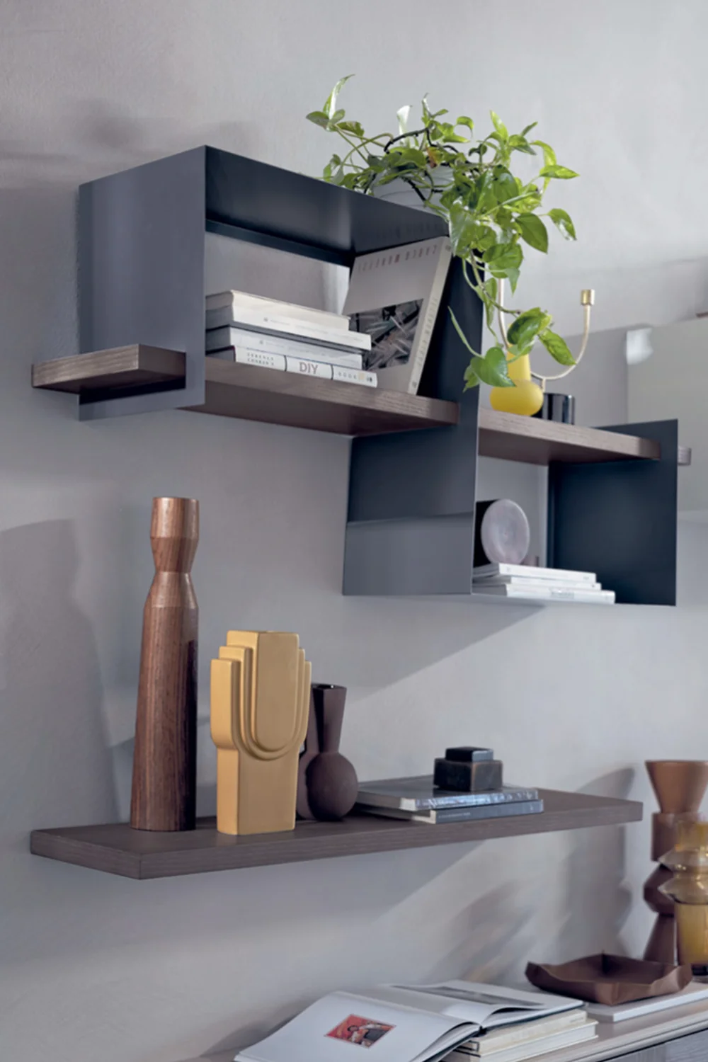 This wall unit stands out for its structure, which is divided into three parts that flawlessly integrate, creating an effect of dynamism and balance. The base, which extends throughout the whole composition, comprehends drawers, doors and open compartments that offer wide storage to organize your personal belongings. A hanging cabinet and a small composition are suspended above the base and enrich the wall unit with a tough of movement and lightness. The clean lines give a sense of airiness, while the overhangs create fascinating play of lights that enhance natural wood grains and add visual depth.