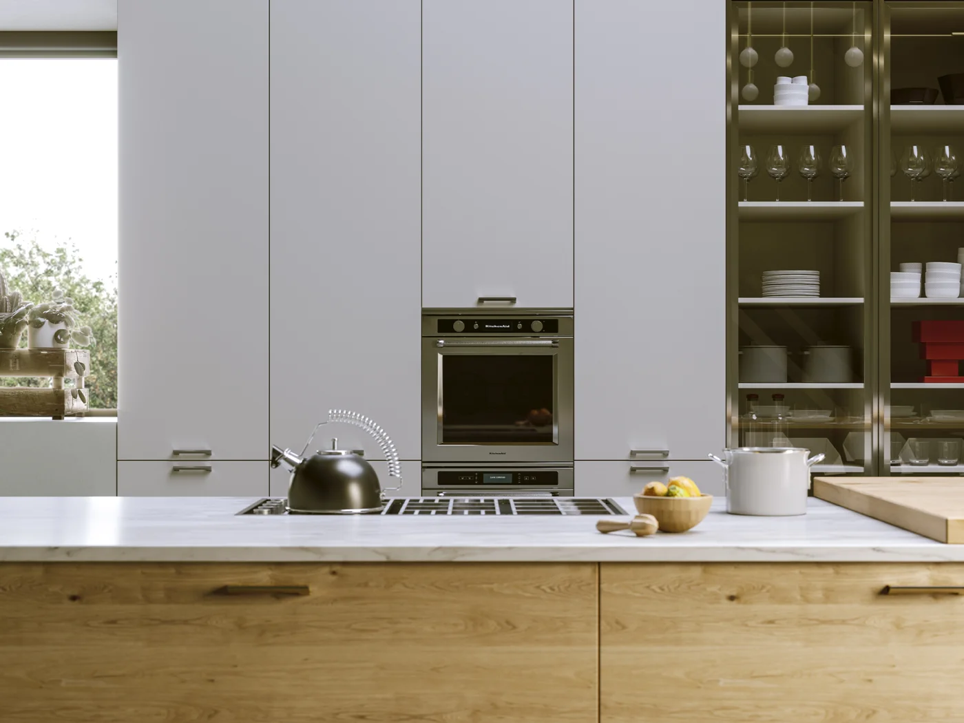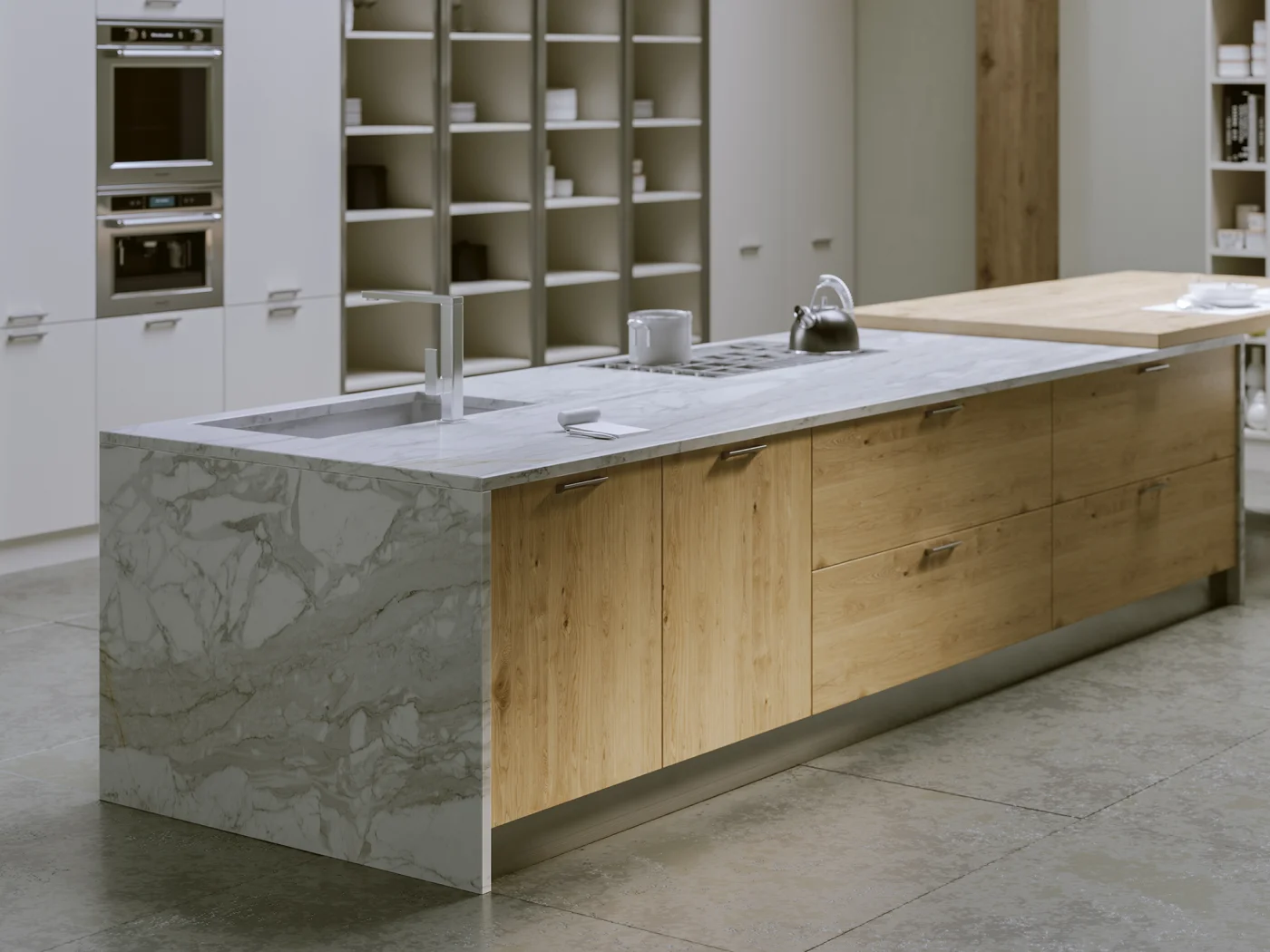 This kitchen stands out for its long vertical lines, which add a refined and contemporary aspect and for its clean lines that define a minimalist and functional design. The long island is one of the central elements of the composition and perfectly integrates all the main elements, such as the sink and stove top, providing a comfortable dining area. All aspects of the Allison kitchen can be customized to suit your needs.