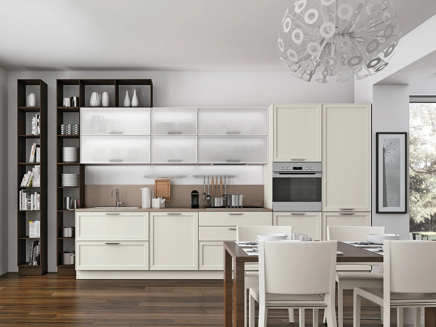 This kitchen is developed linearly and enriched with baskets, drawers, columns and practical vasistas doors with elegant glazed surfaces, giving a bright and light effect. Its uniqueness lies in the open compartments, which frame the structure, renewing the traditional look of the kitchen and improving its storage functionality. Every detail is customizable: from the countertops to the interior and exterior structure, from the glass doors to the handles, allowing you to create a unique and customized kitchen.