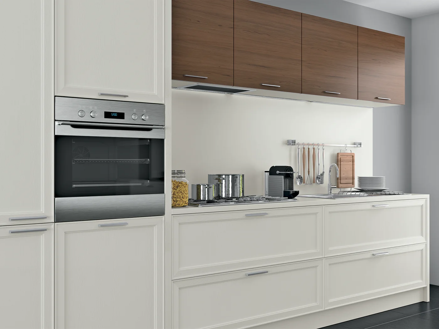 The modern kitchen 04 from Le Fablier’s Melograno collection is a cutting-edge design solution, perfectly in line with aesthetic and functional needs. Its linear composition majestically integrates various elements, such as wide baskets, modern kitchen cabinets and wide columns for an open and multifunctional living, where the kitchen becomes the beating heart of the house.