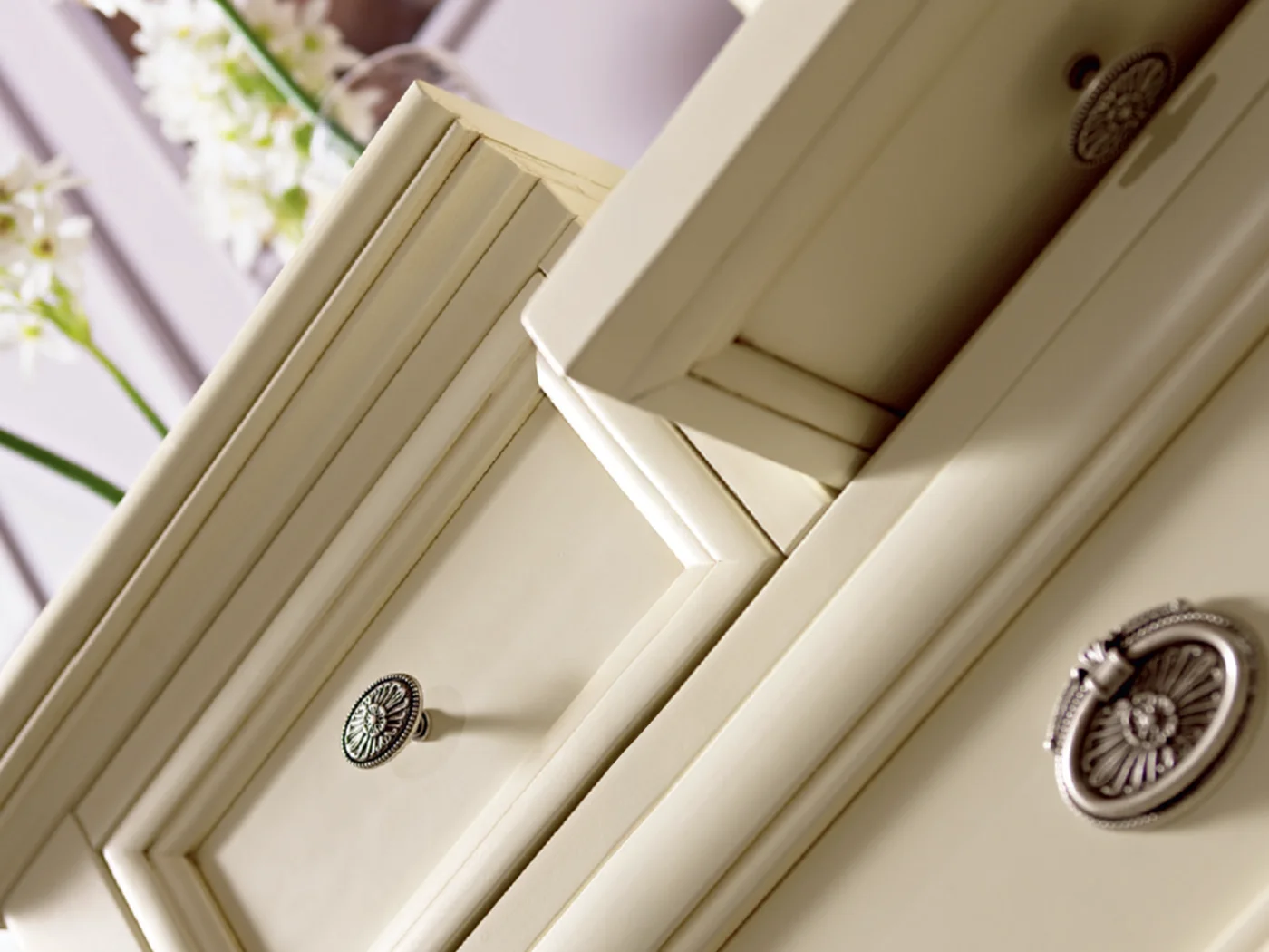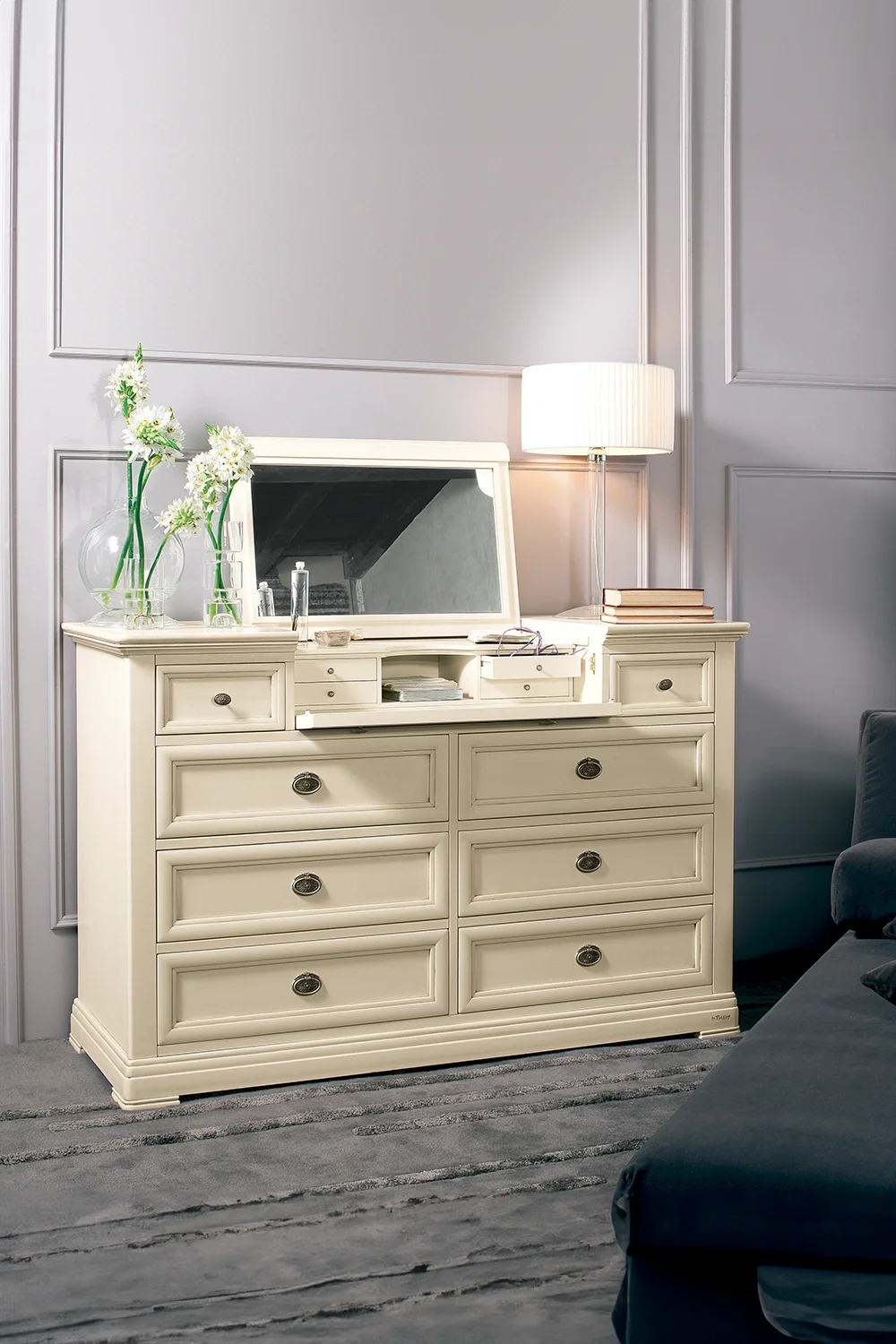Il comò classico Diamante Le Fablier è un'opera d'arte che unisce eleganza e funzionalità, trasformando la camera da letto in uno spazio raffinato e accogliente. Con una struttura in legno di tiglio completa di sei grandi cassetti, il comò moderno Diamante offre ampio spazio per riporre gli oggetti essenziali. La capienza del mobile lo rende ideale per chi cerca un complemento d'arredo che unisca stile e funzionalità. Il marchio a fuoco Le Fablier garantisce l'autenticità e la qualità del comò classico Diamante, distinguendolo dalle imitazioni e confermando l'attenzione per i dettagli e la lavorazione artigianale che contraddistingue ogni arredo della collezione classica Le Gemme. Il comò classico Diamante Le Fablier presenta eleganti e sofisticate maniglie, disponibili in più versioni, ed è possibile averlo in diverse finiture.