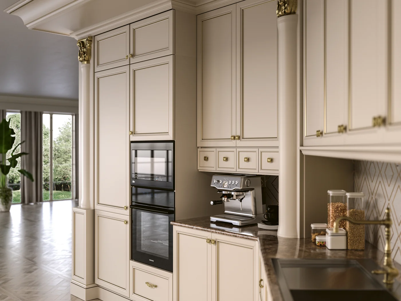 La cucina classica Dorica si distingue per la bellezza dei dettagli e per i molteplici elementi decorativi che ne esaltano l'eleganza, rendendola perfetta per ampi spazi aperti connessi a una zona living. La cucina classica dorica è progettata per integrarsi armoniosamente in ambienti spaziosi e luminosi, dove ogni elemento contribuisce a creare un'atmosfera di eleganza senza tempo.