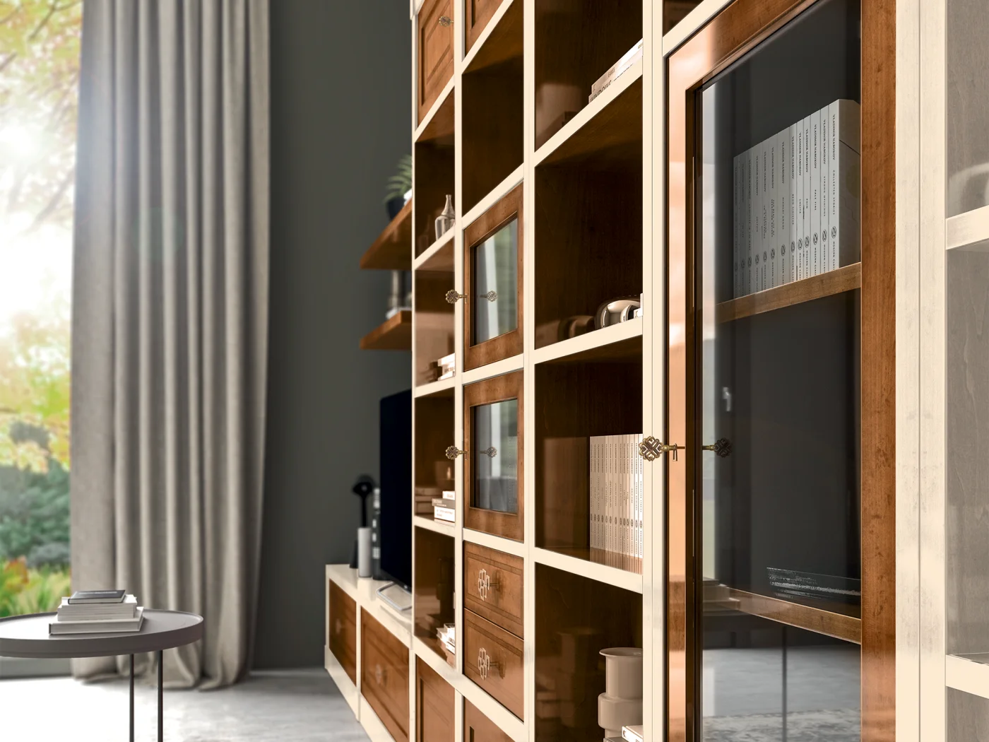 La parete attrezzata classica 01 della collezione Le Mimose Le Fablier è la scelta ideale per chi desidera un arredo che unisca eleganza e calore, perfetto per creare un ambiente intimo e accogliente.