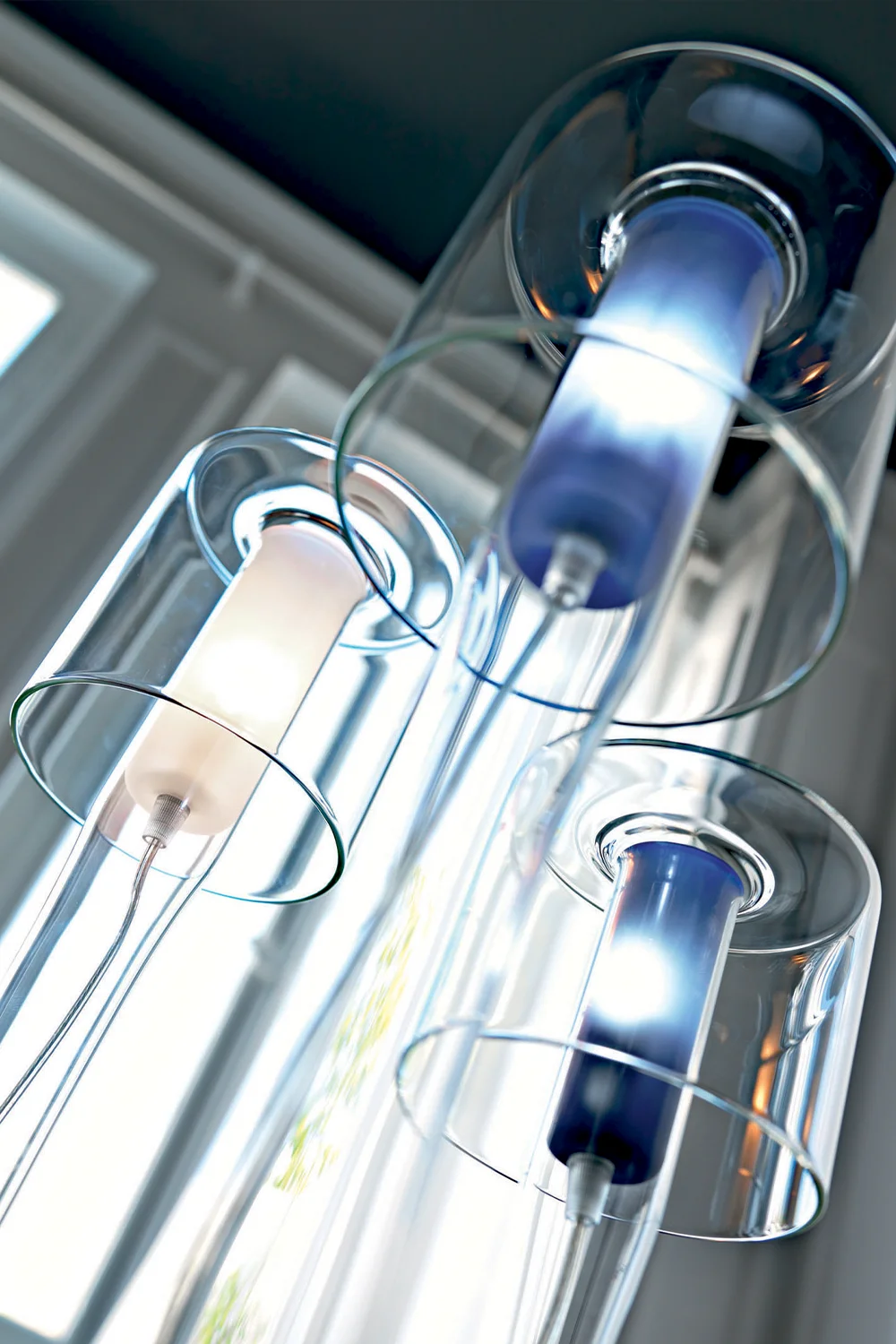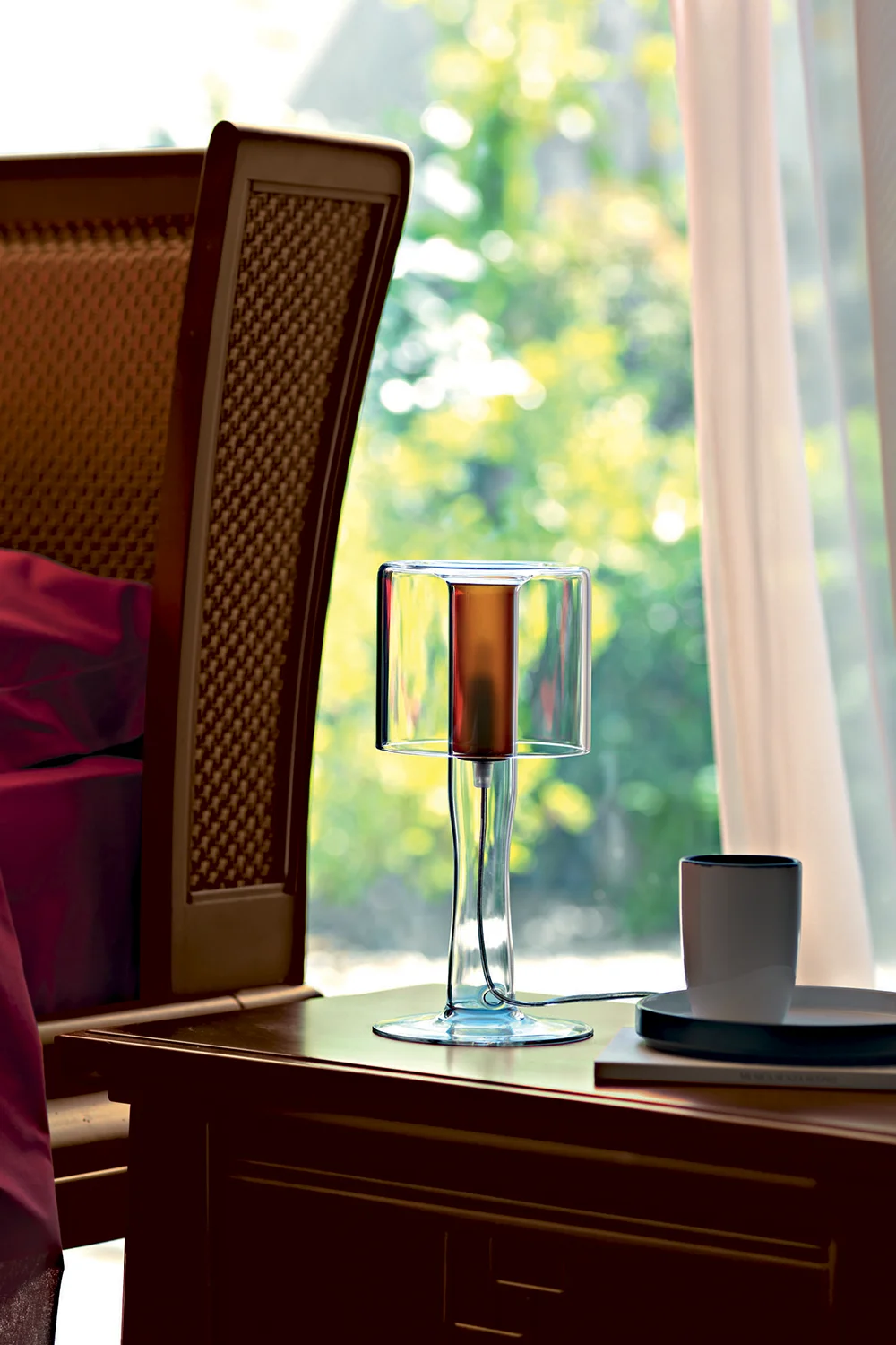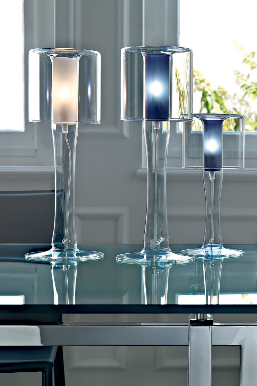 La lampada da tavolo Reishi Le Fablier ha la struttura in pirex trasparente e un bicchiere interno bianco, ambra o blu.