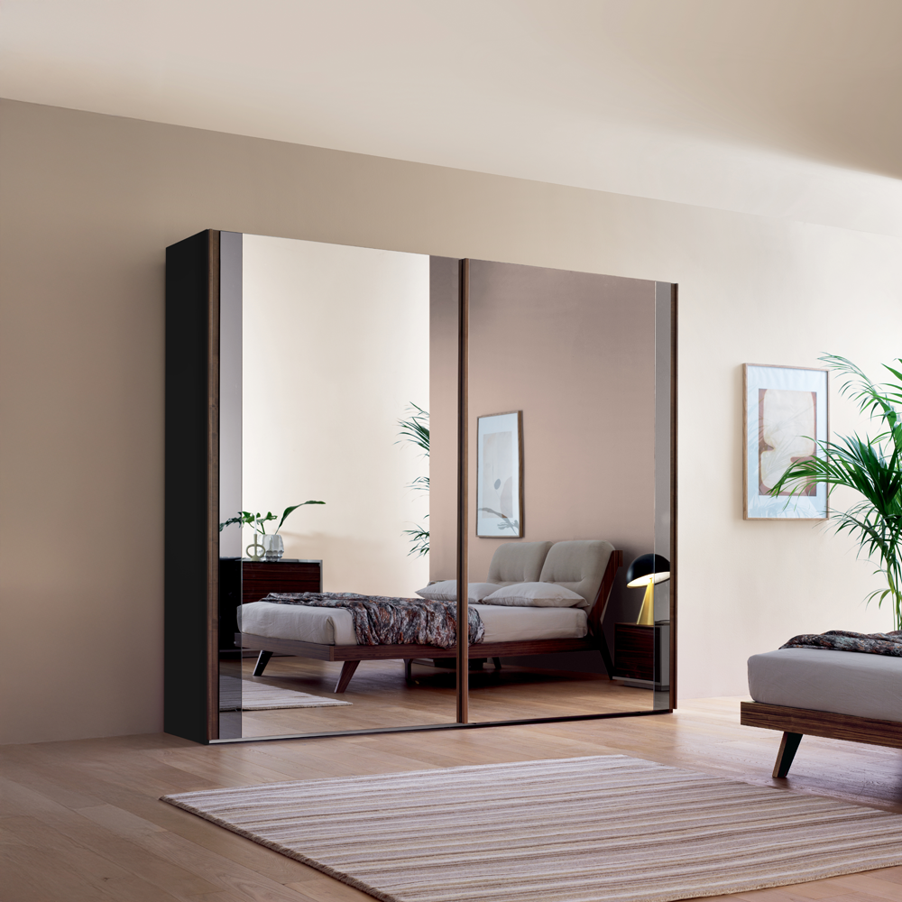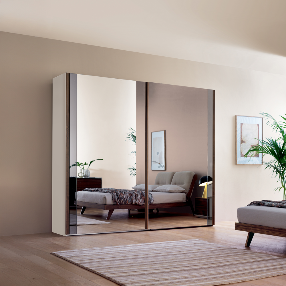Dotato di due ampie ante scorrevoli a specchio, l'armadio moderno Cascata offre una soluzione pratica per ottimizzare gli spazi e allo stesso tempo ampliare visivamente la stanza, riflettendo la luce e donando un effetto di maggiore ampiezza. La scocca laccata, disponibile in finiture eleganti e moderne, completa il design minimalista.