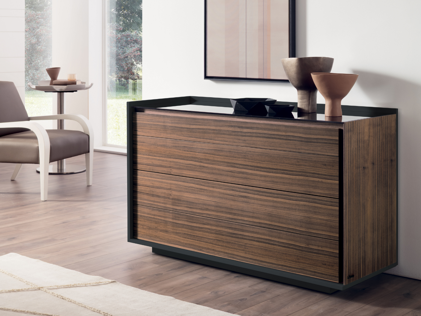 Realizzato in legno di noce canaletto e dettagli in MDF laccato, Il comò Flora è dotato di tre ampi cassetti e un cassetto con vani porta oggetti, offrendo soluzioni pratiche per l’organizzazione degli spazi.