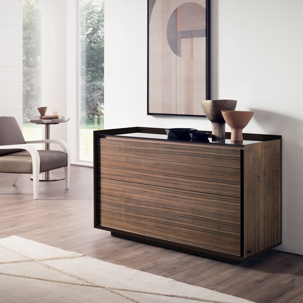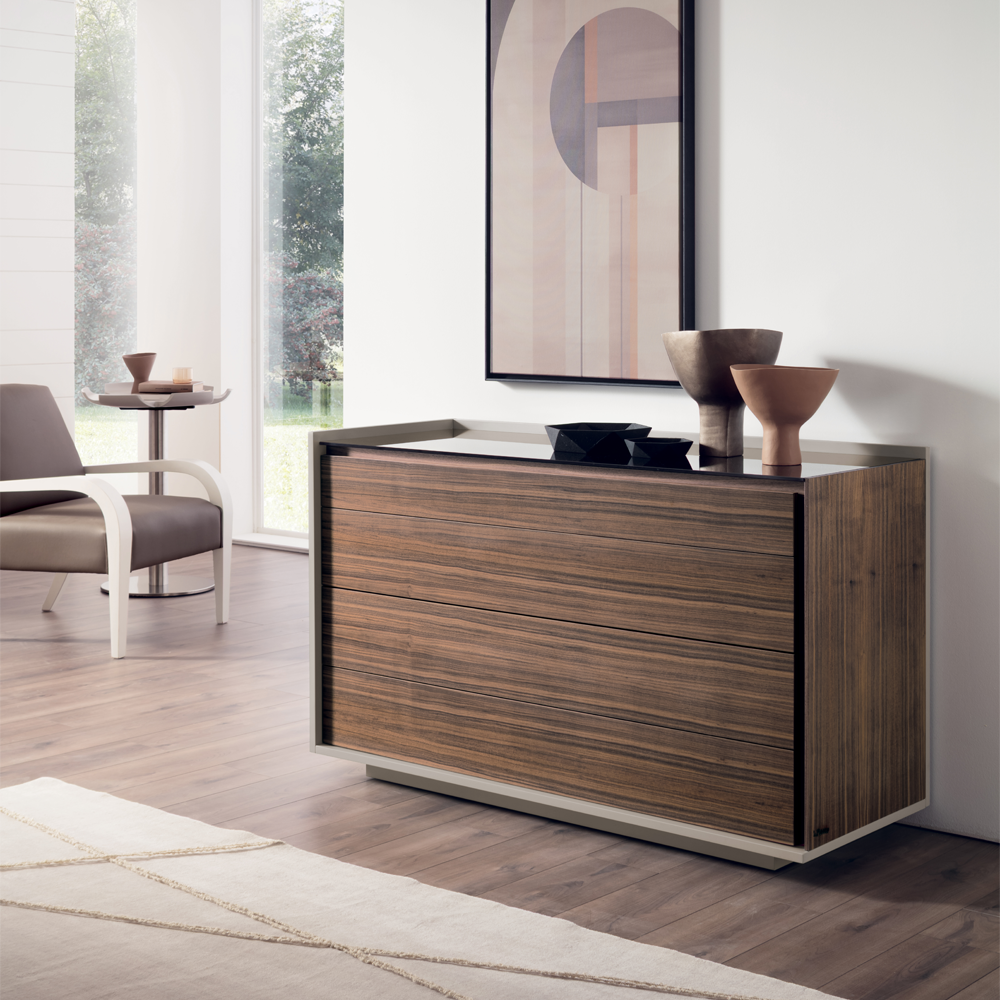 Il piano in vetro fumé aggiunge un tocco di modernità e leggerezza, enfatizzando il design e rendendo il comò un elemento distintivo in qualsiasi ambiente. Disponibile anche la versione con top in legno in essenza.