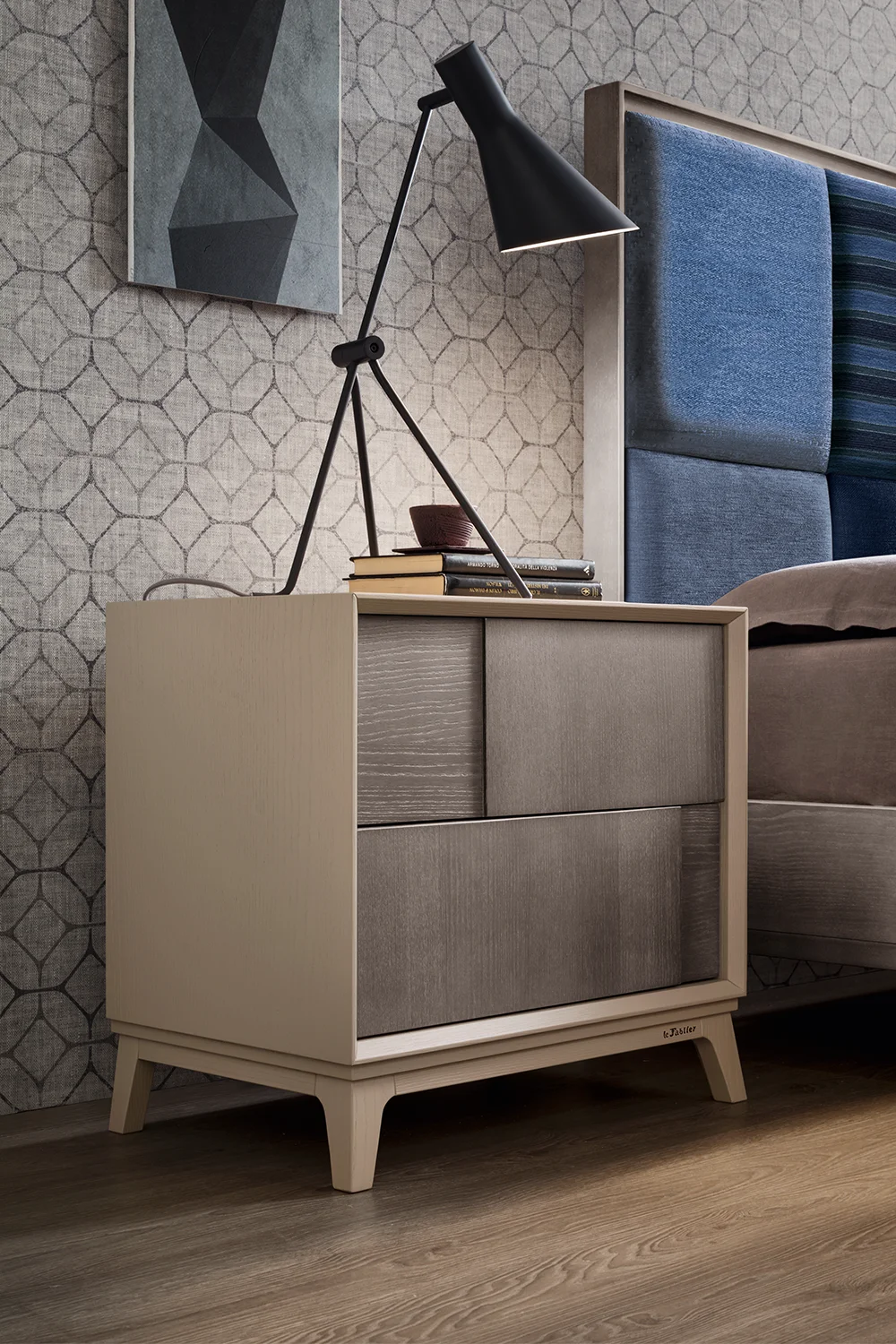 Il comodino moderno Curcuma Le Fablier è caratterizzato da due cassetti con apertura push-pull e dalla presenza di piedi in legno.