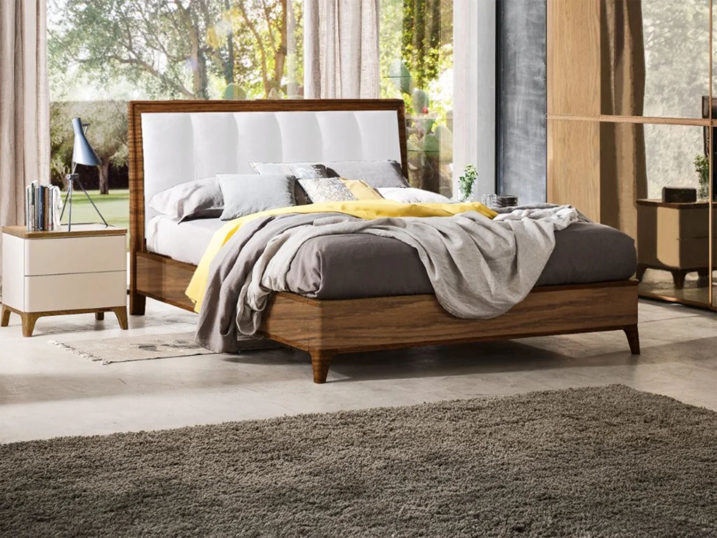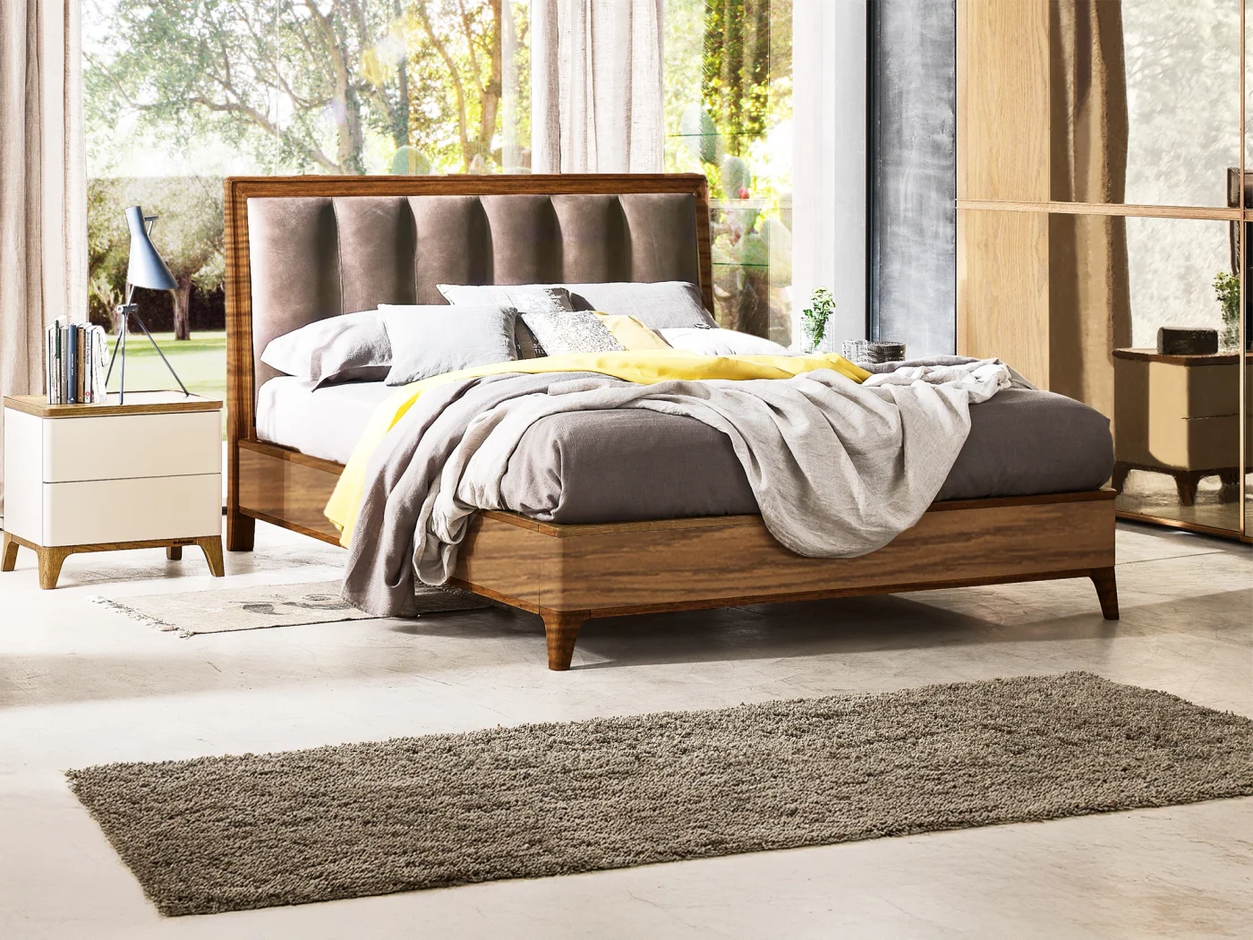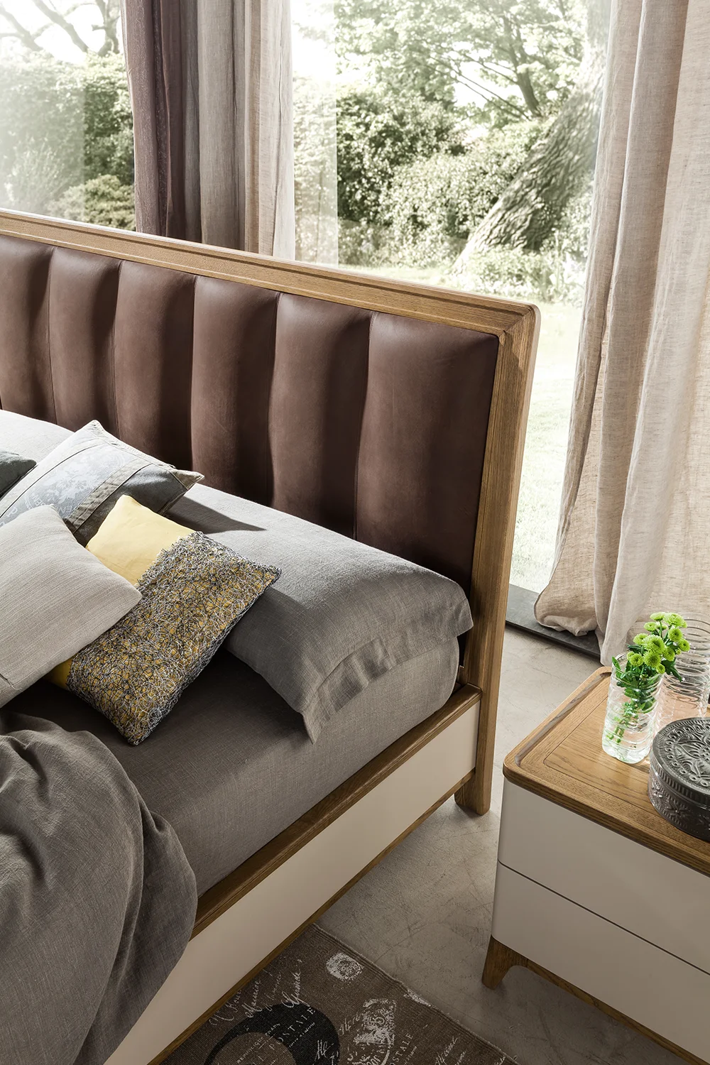 La testiera del letto moderno Deva è impreziosita da un'imbottitura ricercata e avvolgente, incorniciata da una elegante bordatura in legno rovere massello.