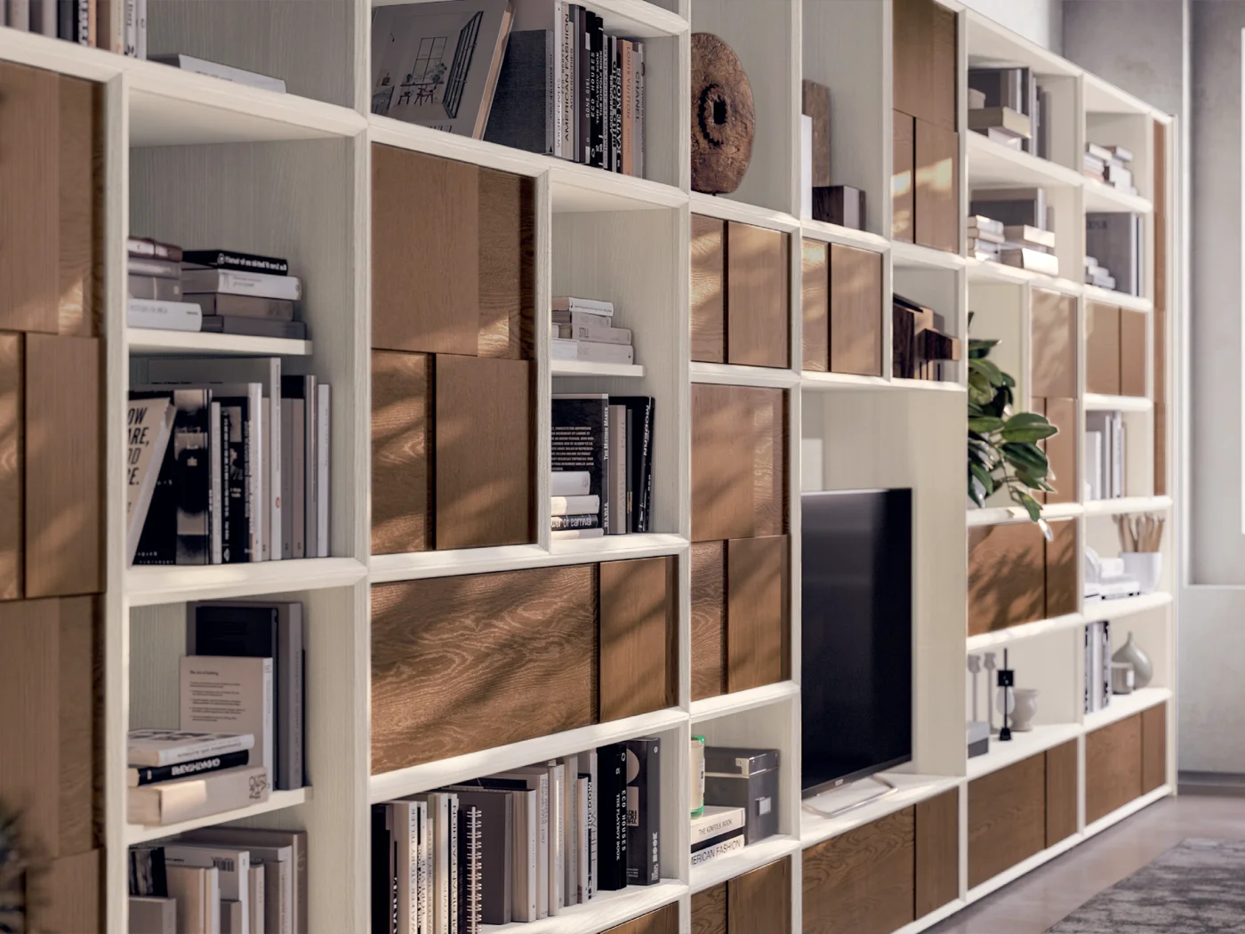 La parete attrezzata moderna 25 si distingue per il suo grande gioco di vani chiusi e vani a giorno, che si alternano in un design sofisticato e funzionale. Al centro della composizione, è posizionato uno spazio dedicato alla TV, creando un punto focale elegante e pratico.