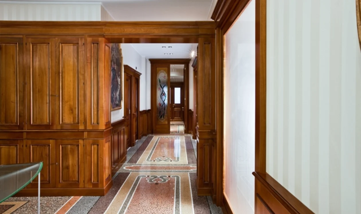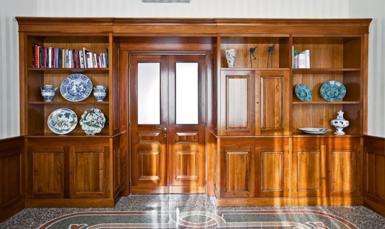 Rivestimento con boiserie in ebanisteria delle strutture con inserimento di librerie, tavoli e sala riunioni